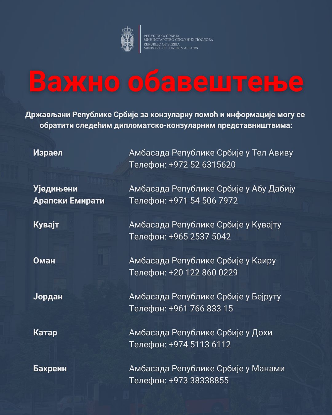 Држављани Републике Србије који се налазе у региону Блиског истока, ради конзуларне помоћи и добијања додатних информација, могу се обратити следећим дипломатско-конзуларним представништвима: